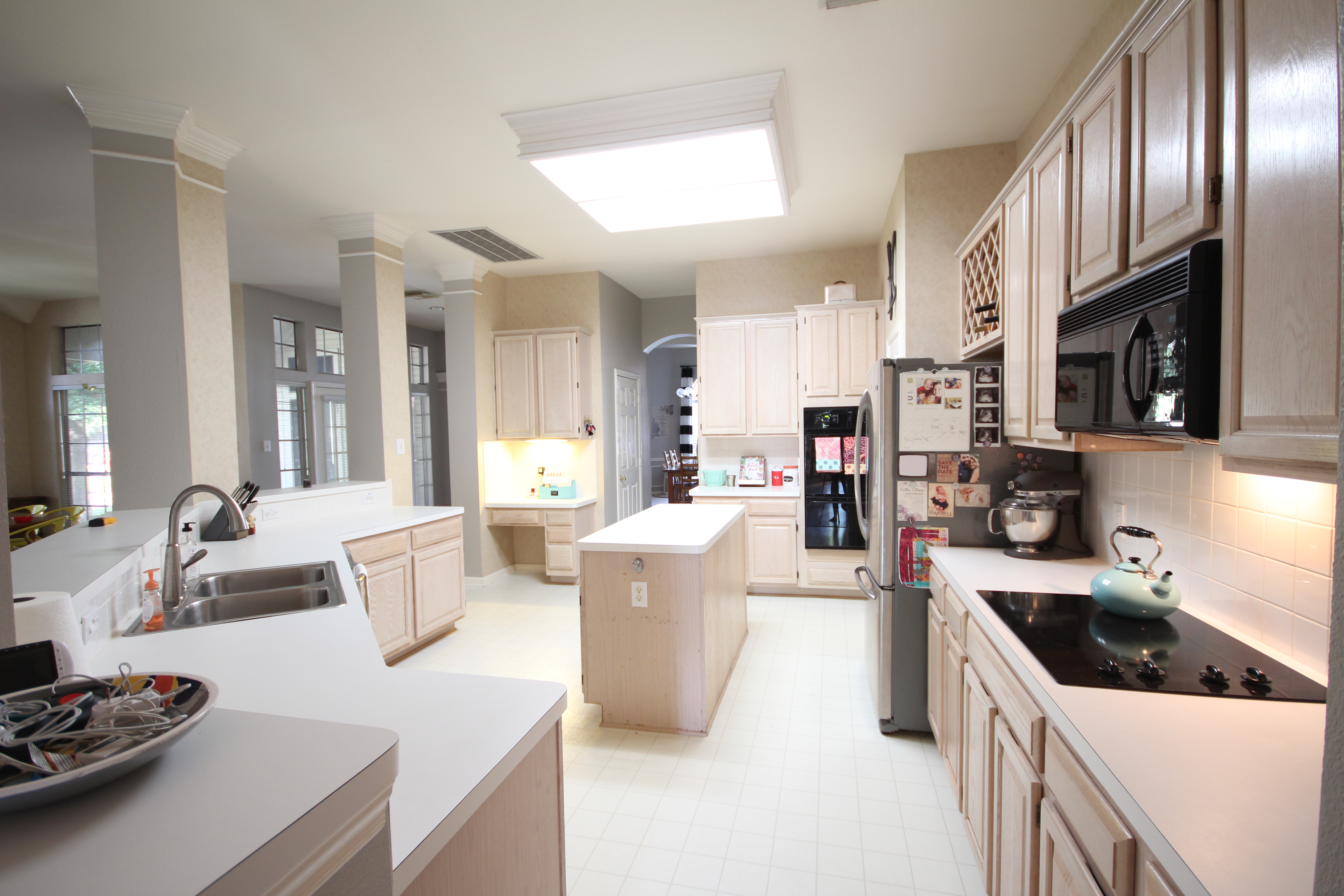 Guess what?! We started our kitchen remodel! We have been planning this for years and it’s finally here! We found a great carpenter and they started a few weeks ago. I wanted to post a few “before pictures” because who doesn’t love a good before & after :) We fell in love with this house because of the open floor plan, the size of the kitchen and the fact that it’s the center of the home! We have been here a little over two years and even thought the kitchen was very 1994, thankfully it wasn’t offensive…. neutral nineties haha. The worst part honestly was the boxed florescent lighting and my husband fixed that last year. We are keeping the same layout but making a bunch of little changes (and some big ones)… I’ll post some pictures of our selections and our process over the next few weeks. Goodbye pickled oak, linoleum, vinyl and wallpaper. If you want more behind the scenes follow along on my Instagram @taylormadecreates